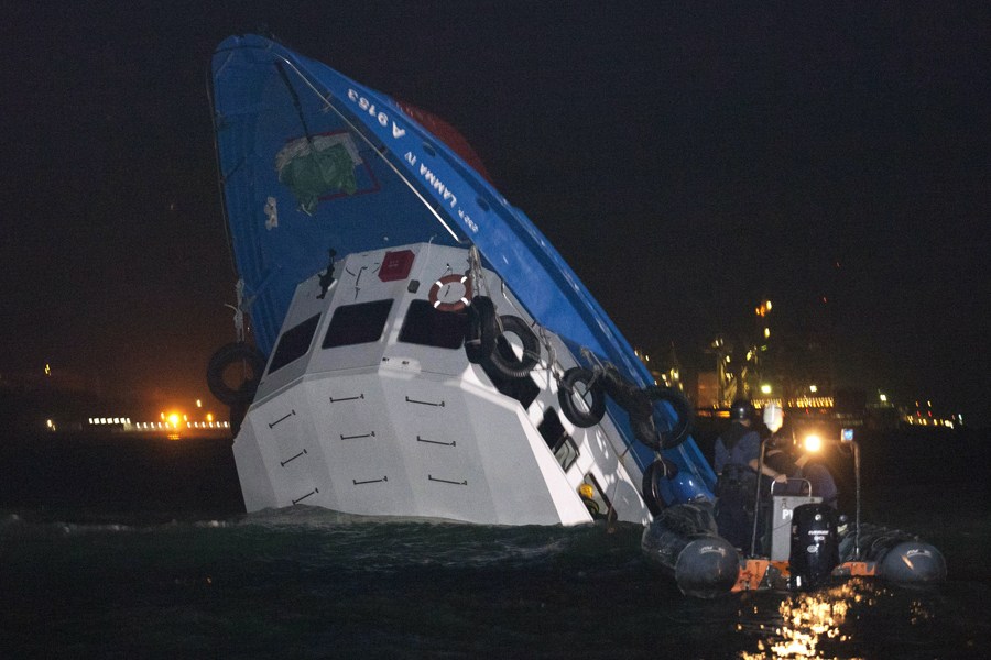 10月1日晚,香港南丫島榕樹灣附近海面被撞沉的渡輪,現(xiàn)場救援。