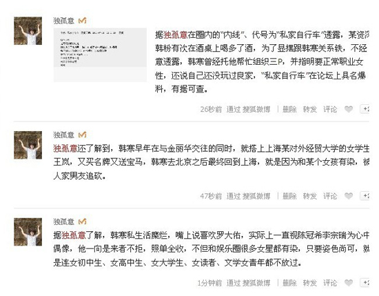 獨孤意透露,韓寒私生活糜爛,嘴上說喜歡羅大佑,實際上一直視陳冠希李宗瑞為心中偶像,他一向是來者不拒,照單全收,不但和娛樂圈很多女星都有染,只要姿色尚可,就是連女初中生、