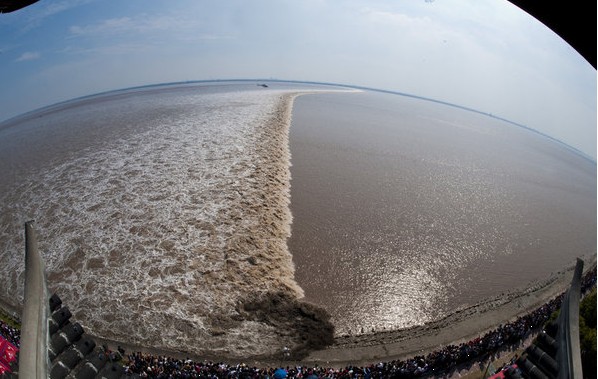 短短幾分鐘時間,堤壩上“咔嚓”聲四起,許多外地趕來看潮的游人更是興奮,男友托起女友、父親舉起孩子……