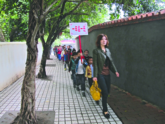 為了保證安全,孩子們?cè)诶蠋煄ьI(lǐng)下錯(cuò)峰上下學(xué)……