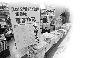 在網(wǎng)上,莫言的作品同樣大賣。得獎(jiǎng)前,莫言作品《蛙》的銷售,在亞馬遜商城圖書(shū)商品里排在第560名。到了昨天,最暢銷作品前5名中,有3本是莫言的作品。