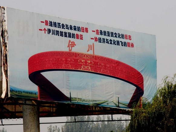 路邊廣告牌上的伊川北大門效果圖上寫著“它承載我們的圣賢文化,象征著伊川的跨越發(fā)展,是經(jīng)濟與文化騰飛的精神圖騰”。