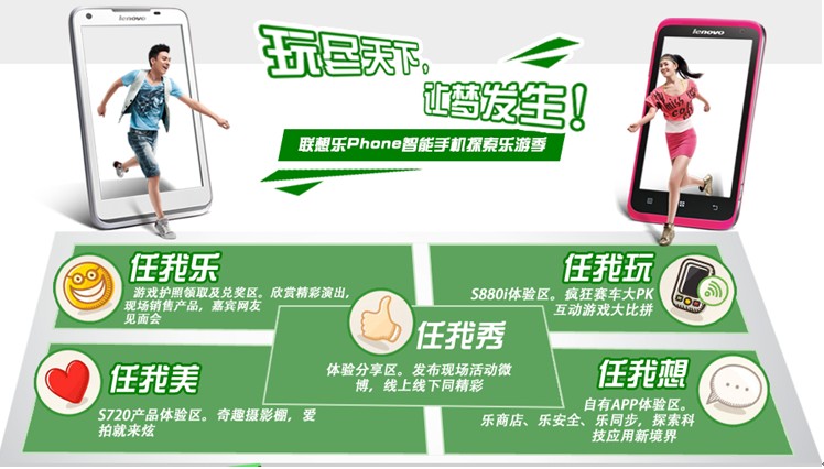????不為平庸的生活所束縛,才能擁有自由的靈魂。勇敢探索未知的美好世界,才能發(fā)現(xiàn)最真實的自己。繼音樂達人、運動達人在全國掀起全民音樂潮、運動潮后,“玩盡天下,讓夢發(fā)生”聯(lián)想樂Phone智能手機探索樂游季大型主題活動盛大起航,邀您加入聯(lián)想樂Phone“Discovery Doer探索達人”活動,更有超豐富夢想旅游大獎及熱門智能手機等你贏取,你準備好了么? ????深秋10月,聯(lián)想樂Phone探索達人火爆路演在西安、南京、濟南、合肥、鄭州、武漢、廈門、成都、沈陽九大城市重點商圈聯(lián)動開展,開啟不平凡探索旅程的神秘大門?,F(xiàn)場朋友只要參與體驗就能收集區(qū)域個性貼紙。任我樂:游戲護照領(lǐng)取及兌獎區(qū);任我美:樂Phone S720產(chǎn)品體驗區(qū),奇趣攝影棚,愛拍就來炫;任我玩:樂Phone S880i產(chǎn)品體驗區(qū),瘋狂賽車大PK,互動游戲大比拼;任我想:自有APP體驗區(qū),樂商店、樂安全、樂銅鼓,探索科技應用新境界;以及任我秀:用戶體驗分享區(qū),發(fā)布現(xiàn)場活動微博。集齊貼紙即可獲得100%中獎機會,獎品豐富精美、更有大獎S720手機等你拿! ????實現(xiàn)旅行夢想 六大雙核明星產(chǎn)品為夢而生