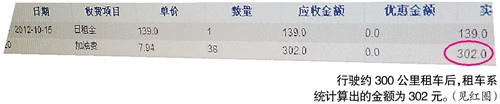 ????昨日下午5時左右,本報記者隨同阿平到上述地點還車。阿平租用該車輛期間總共行駛里程約300公里,神州租車的工作人員觀測油量顯示后,通過系統(tǒng)計算出來的用油結果:總共用油38升,按照加93號汽油每升7.94元的價錢計算,需交302元油錢。不過,阿平對此有異議:不到300公里的路程需要302元油錢,按照他對該款車的理解,是不太可能的。另外一名工作人員則再次對車的油量顯示進行檢測,這位工作人員用計算器算出來的結果是,大概用油238元。阿平對這一結果比較認可,然而,這一結果被此前的那位工作人員粗暴否決,堅持認為應該按照他通過系統(tǒng)計算出來的方法結算油錢。