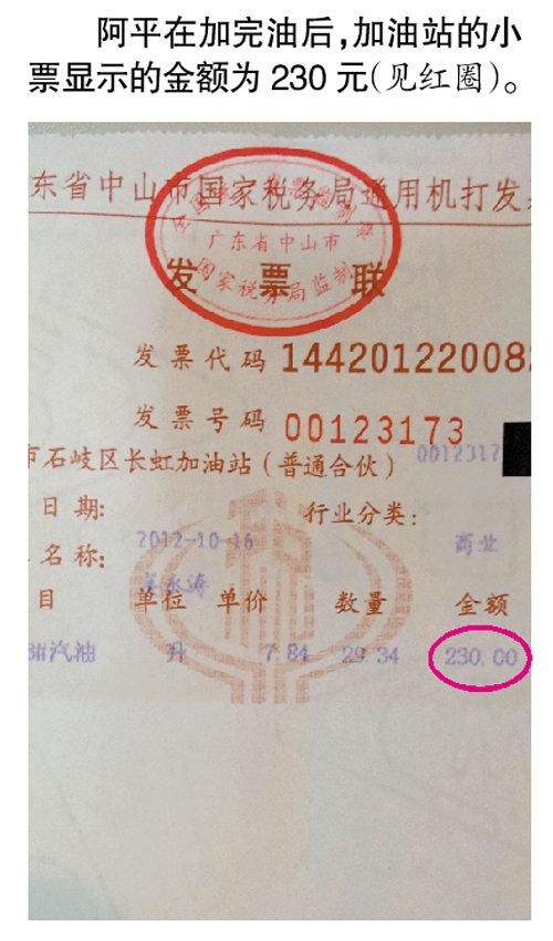 ????阿平認為,按照世嘉油箱整箱油60升計算,油量顯示那里總共12格,每格5升。如果不是因為清潔車輛使得油量顯示掉了一格下來,自己就得額外負擔這5升油的費用。