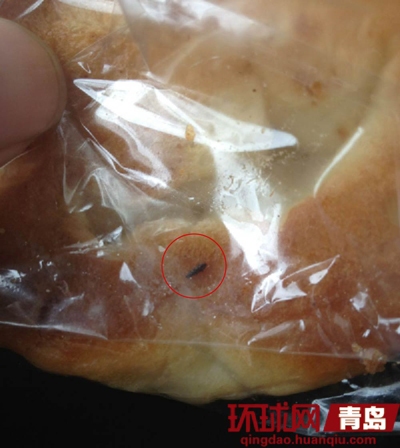 鎮(zhèn)江路店買了一份核桃豆沙面包作為第二天早上的早餐,該面包售價為3.5元,生產(chǎn)日期為2012年10月14日,保質(zhì)期為4天。16日早上,毛先生將面包拿出準備食用,“沒想到包裝袋剛拆到一半時,就發(fā)現(xiàn)袋里有只黑蟲子。”