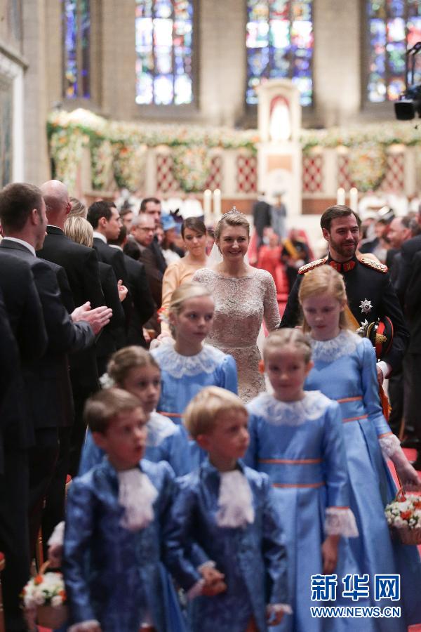 10月20日,盧森堡大公儲(chǔ)紀(jì)堯姆(后右)與大公儲(chǔ)妃斯蒂芬妮(后右二)在盧森堡圣母大教堂舉行宗教婚禮。新華社發(fā)(盧森堡大公府提供照片)