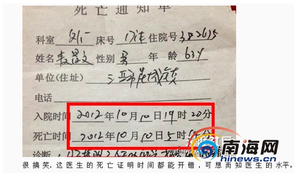醫(yī)院開具的死亡證明有明顯的時(shí)間錯(cuò)誤(南海網(wǎng)記者劉麗萍截圖)