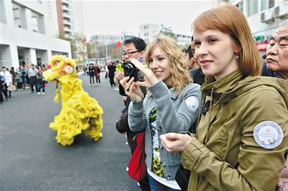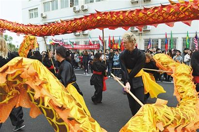 ■日前,青島大學(xué)漢語言學(xué)院舉行第五屆國際文化藝術(shù)節(jié)。學(xué)院30多個國家的400余名留學(xué)生展示中外飲食、書法、繪畫、剪紙、篆刻,并表演了舞龍、舞獅、武術(shù)、秧歌、京劇等中華傳統(tǒng)的民間藝術(shù)。 王 群 攝