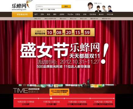 ????據(jù)悉,一向?qū)W⒂谂允袌龅臉贩渚W(wǎng),今年也以勢不可擋之勢加入了雙十一的營銷戰(zhàn)。不同于淘寶網(wǎng)泛泛的“光棍”概念,樂蜂網(wǎng)更堅持于女性細分市場,從女人消費者角度出發(fā),推出“樂蜂網(wǎng)盛女節(jié),天天都是雙十一”主題活動,在這個特殊的節(jié)日為盛女們成功“脫光"奉獻了上百種的美麗解決方案。