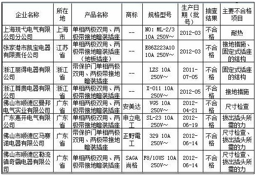 ????國家質(zhì)檢總局近日在其官網(wǎng)公布了插座產(chǎn)品質(zhì)量國家監(jiān)督抽查結(jié)果。結(jié)果顯示,安美達、申立電工、正野電工、SAGA 尚格等8種產(chǎn)品不合格,涉及到耐熱、接地措施、固定式插座的結(jié)構(gòu)、拔出插頭所需的力、尺寸檢查項目。