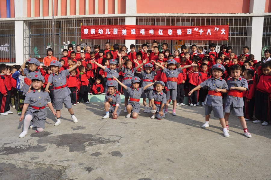 10月31日,江西省德興市泗洲鎮(zhèn)銅礦中心幼兒園200名小朋友在老師的指揮下齊聲合唱紅歌,一群穿紅軍服的小朋友載歌載舞迎十八大。