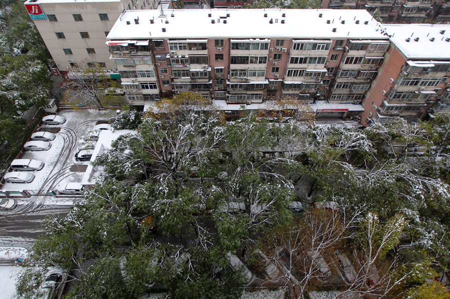 11月4日,北京朝陽(yáng)區(qū)安貞里三區(qū),大樹被雪壓成放射狀。