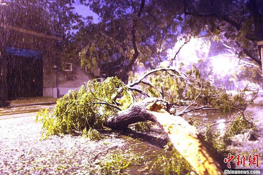 11月4日凌晨,北京的持續(xù)中雨因大風(fēng)降溫改為雨加雪,降下年度初雪,城區(qū)部分地區(qū)降雪量超過10厘米。圖為當(dāng)日北京大風(fēng)降溫雨雪天氣夜景。