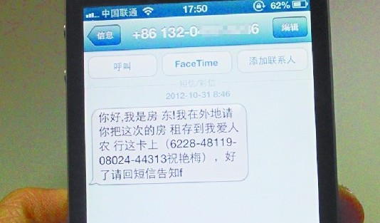 ???? “剛交的房租怎么又讓交?”11月初,市民王女士突然接到一條陌生號碼發(fā)來的催交房租短信,對方自稱房東,因在外地出差讓把房租打到他愛人的銀行賬號上。疑惑不解的王女士撥打這個號碼卻一直接不通,她又撥通原來留有的房東電話,這才知道有騙子冒充房東發(fā)來短信。