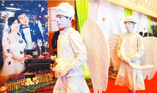????11月10日,黑龍江中路一家星級酒店內(nèi),前來參加婚禮的賓客被婚宴上的“活體雕塑”吸引住,紛紛拍照合影。記者看到,當(dāng)天婚禮上出現(xiàn)的“活體雕塑”有兩種:一種是全身涂成白色的天使,負責(zé)引導(dǎo)賓客入席;一種是涂滿黑色和銅色顏料的金童玉女,負責(zé)指引來賓簽到。 記者 何毅