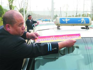 出租車駕駛員統(tǒng)一張貼眉條 慶祝十八大召開