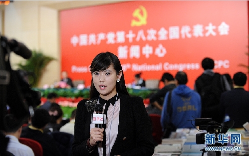 2012年11月10日,中國共產(chǎn)黨第十八次全國代表大會(huì)舉行第二場記者招待會(huì),請(qǐng)國家發(fā)展和改革委員會(huì)主任、黨組書記張平介紹中國經(jīng)濟(jì)和社會(huì)發(fā)展情況,并回答記者提問。圖為新華社CNC電視記者正在記者會(huì)現(xiàn)場出鏡拍攝。新華網(wǎng)陳競超 攝