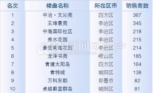 伴隨著各個(gè)保障房項(xiàng)目選房的相繼結(jié)束,青島樓市成交量有了顯著增長(zhǎng),縱觀上周銷量排行榜TOP10,商品房全部“黯然失色”,前八名均為保障房項(xiàng)目占據(jù),大部分項(xiàng)目分布在李滄、四方、城陽(yáng),直接導(dǎo)致了青島市區(qū)樓市全面“升溫”。