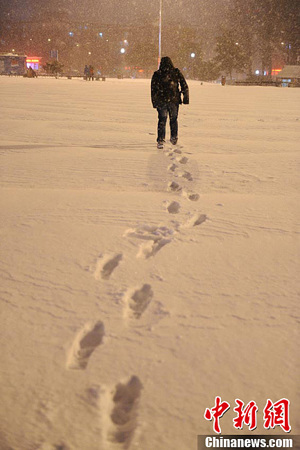 截至12日19時,長春市這場大規(guī)模降雪仍在繼續(xù),已達(dá)到暴雪級別。隨著雪量的增大和氣溫的下降,白天濕滑的路面已開始被厚厚的積雪所覆蓋。面對這場降雪,長春各部門均采取應(yīng)對措施,交警全員上崗執(zhí)勤,環(huán)衛(wèi)部門不停地在路面上清雪,供暖部門也做足準(zhǔn)備,延長鍋爐運(yùn)行時間和水溫。據(jù)悉,這場降雪將持續(xù)到后天,不過雪勢會逐漸轉(zhuǎn)弱。圖為路人經(jīng)過的地方留下厚厚的腳印。