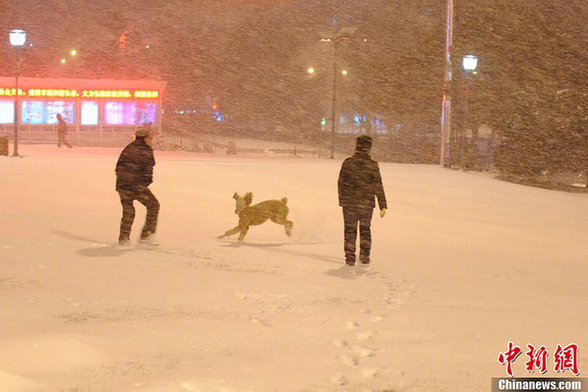 截至12日19時(shí),長(zhǎng)春市這場(chǎng)大規(guī)模降雪仍在繼續(xù),已達(dá)到暴雪級(jí)別。隨著雪量的增大和氣溫的下降,白天濕滑的路面已開(kāi)始被厚厚的積雪所覆蓋。面對(duì)這場(chǎng)降雪,長(zhǎng)春各部門均采取應(yīng)對(duì)措施,交警全員上崗執(zhí)勤,環(huán)衛(wèi)部門不停地在路面上清雪,供暖部門也做足準(zhǔn)備,延長(zhǎng)鍋爐運(yùn)行時(shí)間和水溫。據(jù)悉,這場(chǎng)降雪將持續(xù)到后天,不過(guò)雪勢(shì)會(huì)逐漸轉(zhuǎn)弱。圖為傍晚市民在戶外與小狗玩耍。
