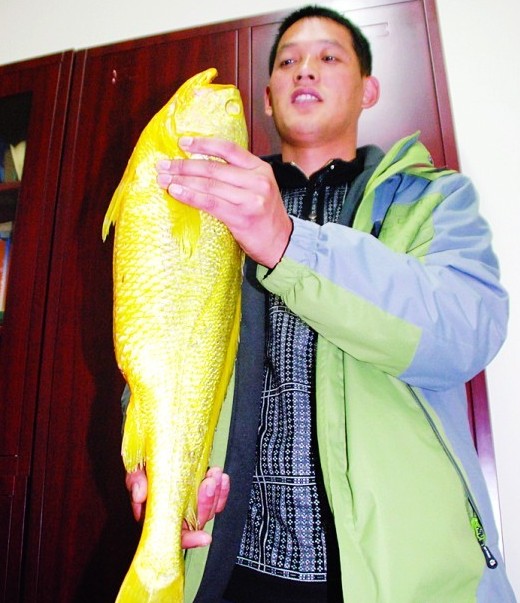 ????11月11日,膠南某水產(chǎn)公司一位漁民在膠南的外海撈出一條金色的大魚,這條魚長62厘米,重4斤6兩,全身金黃。漁民剛開始以為是大黃花魚,不過,經(jīng)過黃海水產(chǎn)研究所的魚類史專家鑒定,初步認(rèn)為是黃唇魚的可能性比較大,這種魚的經(jīng)濟(jì)價(jià)值很高。
