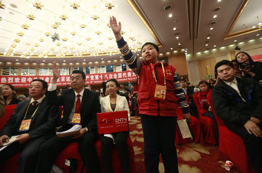 11月11日,十八大新聞中心,中國少年報的小記者跑新聞發(fā)布會,他們要報道開閉幕會,聽小組討論等。小記者張佳鶴舉手提問。