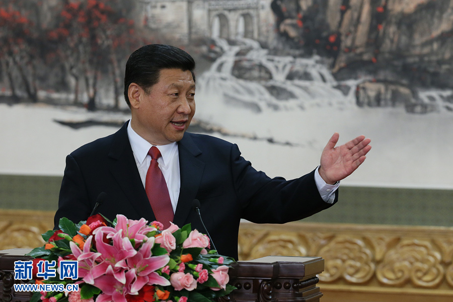 11月15日,剛剛在中共十八屆一中全會上當選的中共中央總書記習近平和中央政治局常委李克強、張德江、俞正聲、劉云山、王岐山、張高麗在北京人民大會堂同采訪十八大的中外記者親切見面。這是習近平總書記發(fā)表講話。(新華社記者 謝環(huán)馳 攝)