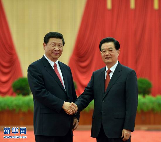11月15日,國(guó)家主席胡錦濤,新當(dāng)選的中共中央總書記、中共中央軍委主席習(xí)近平等領(lǐng)導(dǎo)同志在北京人民大會(huì)堂親切會(huì)見出席黨的十八大代表、特邀代表和列席人員并發(fā)表重要講話。這是胡錦濤和習(xí)近平親切握手。新華社發(fā)