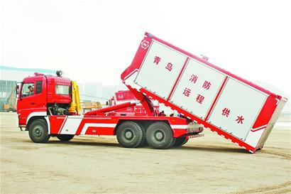 據(jù)介紹,該遠(yuǎn)程供水系統(tǒng)由5輛大型消防車,分為2輛供水泵車和3輛水帶自動(dòng)鋪設(shè)車組成,可分成2個(gè)子系統(tǒng)使用,車上配有拖臂、吊臂和大功率供水泵站。該遠(yuǎn)程供水系統(tǒng)可