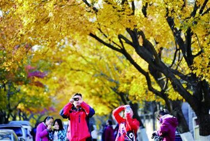????昨日,八大關(guān)的嘉峪關(guān)路聚集了眾多市民,大家舉起相機(jī)在金黃的秋葉下拍照。