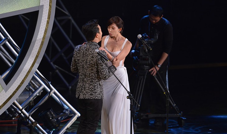 林志玲穿純白女神裝露巨乳纖腰 嘟嘴親黃渤(組圖)