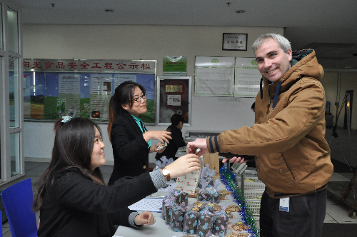 ????為了準(zhǔn)備今天的義賣,二十多位志愿者在公司的廚房里忙活了整整一個(gè)周日的時(shí)間。大家用雞蛋、巧克力、面粉、香蕉等等原料制作了香蕉巧克力瑪芬和巧克力曲奇餅,并加以精美包裝。周一一中午時(shí)間賣出700多元善款,全部用來捐助貧困兒童。