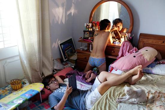 Ly (23歲,商人) 正在讀著Ipad上的新聞等待Huyen's (21歲,設(shè)計師) 收拾好一起出門。他們在一起3年了。