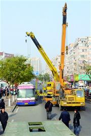 昨天上午10時(shí),兩輛大型吊車和一輛大型拖車來到現(xiàn)場(chǎng)。“我們測(cè)量了一下,這輛大客車長12米,一輛吊車吊不起來,普通拖車還放不下,只好弄來了三個(gè)‘大家伙’。”現(xiàn)場(chǎng)負(fù)責(zé)吊車的某公司負(fù)責(zé)人告訴記者,他們的拖車長度超過了20米,拖兩輛坦克都沒問題,公司還專門特制了工具來固定大客車。