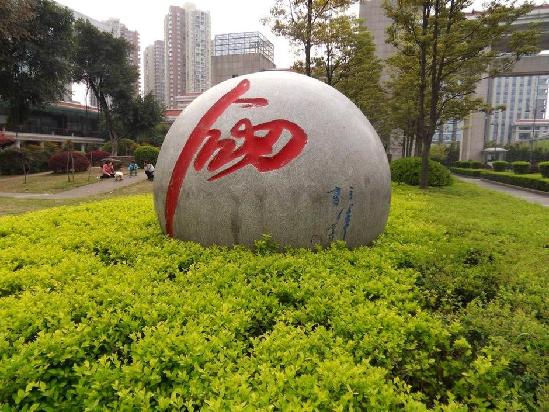2012年11月30日,重慶市公安局大門口石球上,王立軍題寫的“劍” 和“勵”字被鏟掉。圖為2012年3月26日,重慶市公安局大門口石球上,王立軍題寫的“劍” 和“勵”字(資料圖)。