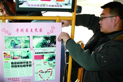????對于于會海想找熱心乘客的想法,他所在的車隊書記張青也非常贊同。張青告訴記者,于會海的事跡報道之后,車隊也一直借助媒體的力量尋找那些好心人,“紅衣大姐”褚鳳蘭就是乘客向車隊提供的線索??墒窃隈银P蘭之后,他們就再沒有接到其他3位愛心乘客的信息,為此車隊也很著急。在于會海病情穩(wěn)定出院后,車隊將尋找熱心乘客的工作也當作主要工作來做,他們向公交集團、巴士公司的領(lǐng)導匯報后決定利用211路公交車作為平臺,在車廂醒目位置設(shè)置一塊固定展板,宣傳于會海的事跡,同時通過這一車廂“微博”尋找另外3位熱心人。