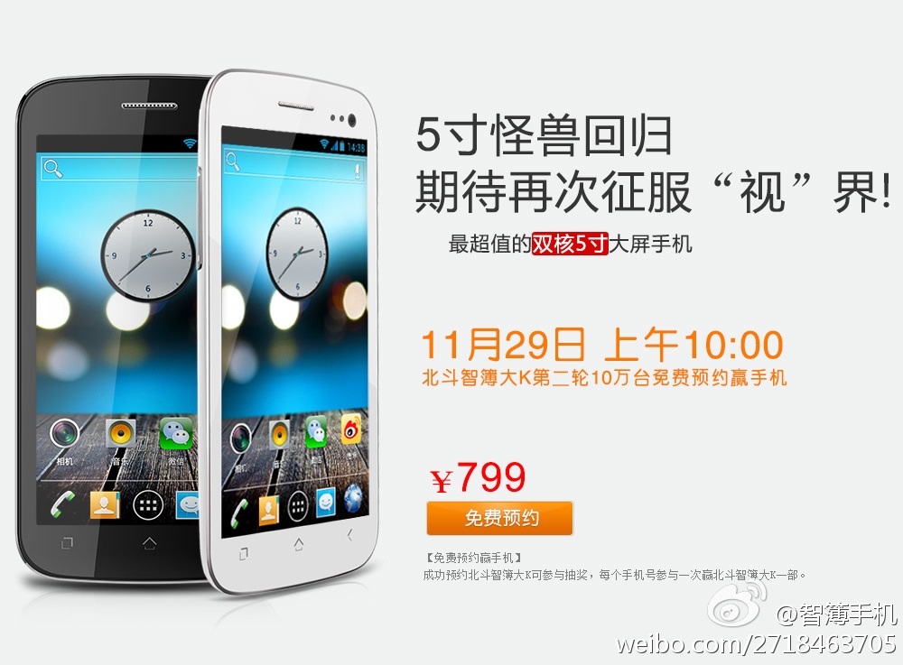 繼699元推出雙核小辣椒、999元推出四核北斗中興小旋風(fēng),把手機(jī)江湖攪得腥風(fēng)血雨之后,譚文勝再度重拳出擊,于今天上午10時(shí)正式發(fā)售十萬臺(tái)價(jià)格僅為799元的雙核5寸大屏互聯(lián)網(wǎng)手機(jī)智簿大K。