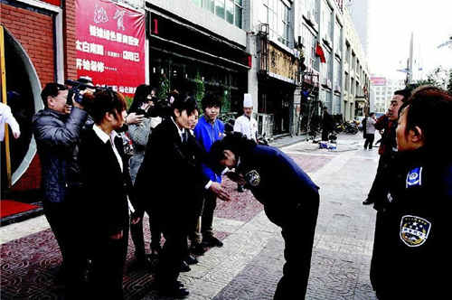 本報商洛訊(記者 冀暉)昨天下午,軟面店和城管收費人員“頂?!币皇掳l(fā)生了戲劇性的一幕,收費中心的領(lǐng)導(dǎo)帶領(lǐng)幾名收費人員來到軟面店門前,列隊鞠躬向軟面店的代表們表歉意,軟面店愿接受對方的致歉,并交納了4845元垃圾處理費。雙方握手言和,表示互相理解。