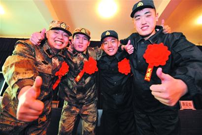 記者采訪了解到,20名新兵中,有大學學歷的不在少數(shù),甚至還有從美國休學專門回來參軍的留學生。21歲的張權在美國一所大學讀建筑設計,按照美國大學的學分制,他已經(jīng)修完學業(yè)四分之三的學分,只需再努力半年,就能修完學分繼續(xù)讀研?!拔乙讲筷犎ュ憻掑憻?,成為一名真正的男子漢?!睆垯嘞蚣依锾岢鲆輰W回國參軍的想法,立刻得到家人的認同?!昂⒆哟罅?,有自己的見解,我們?nèi)胰送耆??!睆垯嗟哪赣H拍了一下兒子的肩膀,有些自豪地告訴記者,張權的爺爺就是當兵出身,張權從小就是聽“打鬼子”故事長大的,也許爺爺講的這些故事,讓孩子從小就有了參軍夢。