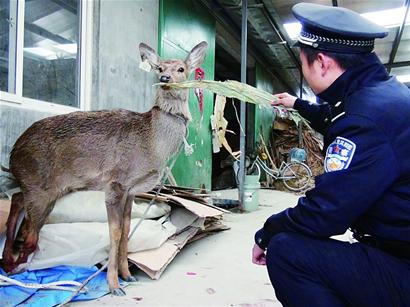 “它不停掙扎,腿上的血一直流,我們想給它包扎,根本摁不住?!泵窬f(shuō),后來(lái)聯(lián)系林業(yè)部門野生動(dòng)物保護(hù)站的專家,通過(guò)描述,確定這是一只未成年的雌性麋鹿,年齡兩歲左右。再看麋鹿的耳朵,上面還釘著標(biāo)簽,分析是養(yǎng)殖麋鹿,八成是在運(yùn)輸路上跑了,不慎摔斷了腿。老劉家緊靠正陽(yáng)西路,“跑單”的麋鹿被過(guò)往車輛嚇壞了,這才跑到老劉家躲避。