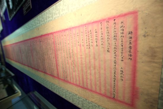 《風(fēng)雨歸程—紀(jì)念中國收回青島90周年珍貴檔案史料展》分為日德青島之戰(zhàn)、日本在青島的殖民統(tǒng)治、“二十一條“交涉、巴黎和會(huì)、太平洋會(huì)議、收回青島六個(gè)部分,通過近百件珍貴檔案、地圖和照片,再現(xiàn)了中國人民為收回青島所進(jìn)行的不屈不撓的抗?fàn)幒褪栈厍鄭u的艱難歷程。本次展覽使用的檔案、地圖和照片除了本館館藏外,很多是從臺(tái)灣、日本和美國征集回來的,均為首次公布。