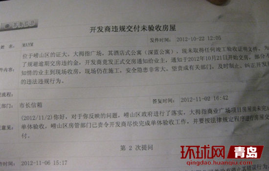同時,業(yè)主們向市長熱線反映此事后也得到明確答復:“嶗山區(qū)政府進行了落實,大拇指商業(yè)廣場項目房屋尚未完全完成單體驗收,嶗山區(qū)房管部門已責令開發(fā)商盡快完成單體驗收工作,并要按法律規(guī)定程序進行房屋交付?!?/p>