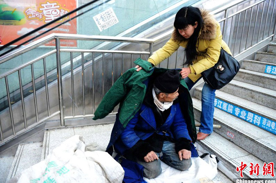 12月11日,臨沂市臨沭83歲的周元武在青島一地下商城邊乞討邊尋找銀行卡失主。連日來,山東青島氣溫降至零下7度,來自臨沂市臨沭83歲的周元武老人一邊在寒風(fēng)中乞討,一邊拿起一個失物招領(lǐng)牌向過路人展示。圖為一位過路市民給臨沂市臨沭83歲的周元武老人披上好心人送來的棉衣。俞方平攝