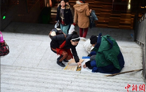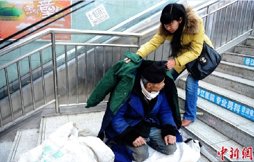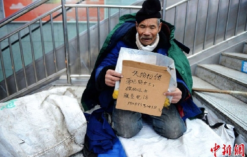 ????12月11日,臨沂市臨沭83歲的周元武在青島一地下商城邊乞討邊尋找銀行卡失主。連日來,山東青島氣溫降至零下7度,來自臨沂市臨沭83歲的周元武老人一邊在寒風(fēng)中乞討,一邊拿起一個失物招領(lǐng)牌向過路人展示。