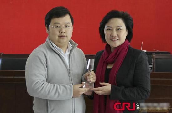 一家媒體的主持人向向十八大代表、南京西花村社區(qū)黨支部書記石磊贈送水晶話筒。