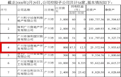 ?廣州華儲房地產(chǎn)開發(fā)有限公司,主營業(yè)務(wù)為房地產(chǎn)經(jīng)營,是截止到2008年2月29日,保利房地產(chǎn)(集團(tuán))股份有限公司控股的58家子公司之一,保利房地產(chǎn)(集團(tuán))股份有限公司直接擁有該公司87.5%的權(quán)益。享有絕對控制權(quán)……(點擊查看全文>>)