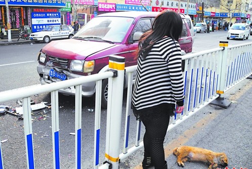 ????在馬路中間護(hù)欄的北邊一側(cè)地上,一條身長大約40厘米、全身黃褐色的小狗躺在地上,頭部滿是鮮血,已經(jīng)死亡。自稱是小狗主人的李女士一直站在小狗旁邊,她說:“我正在店里賣貨,鄰居跑過來問我家貝貝還在不在,說是前面出車禍撞死了一條狗,我趕緊跑過來一看,就是我們家的貝貝,這只小金毛還不到4個(gè)月,生下來后一直跟著我,現(xiàn)在一下子就沒有了,就跟自己的孩子沒有了一樣!”李女士摸著小狗尸體,眼淚掉了下來。
