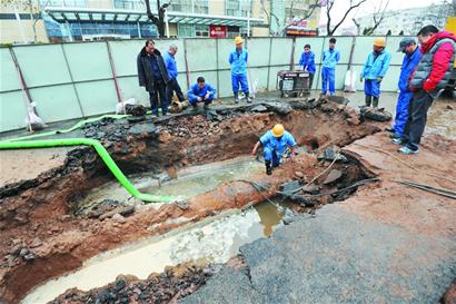 記者在爆管現(xiàn)場看到,延安三路的柏油路面已經(jīng)被大水沖了起來,十多米的柏油面整個掀到路邊,自來水搶修工人已經(jīng)挖開了一個20多平方米的大坑,坑內(nèi)一根直徑600毫米的自來水供水管道正在向外冒水。工人們調(diào)來一臺大型抽水泵,將涌出的水排到不遠(yuǎn)處的一個排水古力井當(dāng)中?!拔覀円呀?jīng)關(guān)閉了周圍的閥門,現(xiàn)在水流不大了,漏點已經(jīng)找到,馬上就要進(jìn)行修復(fù)?!睋屝薰と烁嬖V記者。