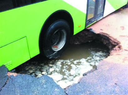 沖走三噸沙大坑陷公交